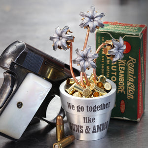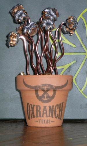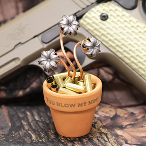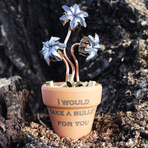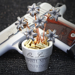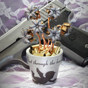 The Three, Four, and Six Bloom Bullet Bouquets use a small flowerpot, which makes the whole piece stand about 4" tall, while the flowerpot is 1.75" in diameter and 2" tall.